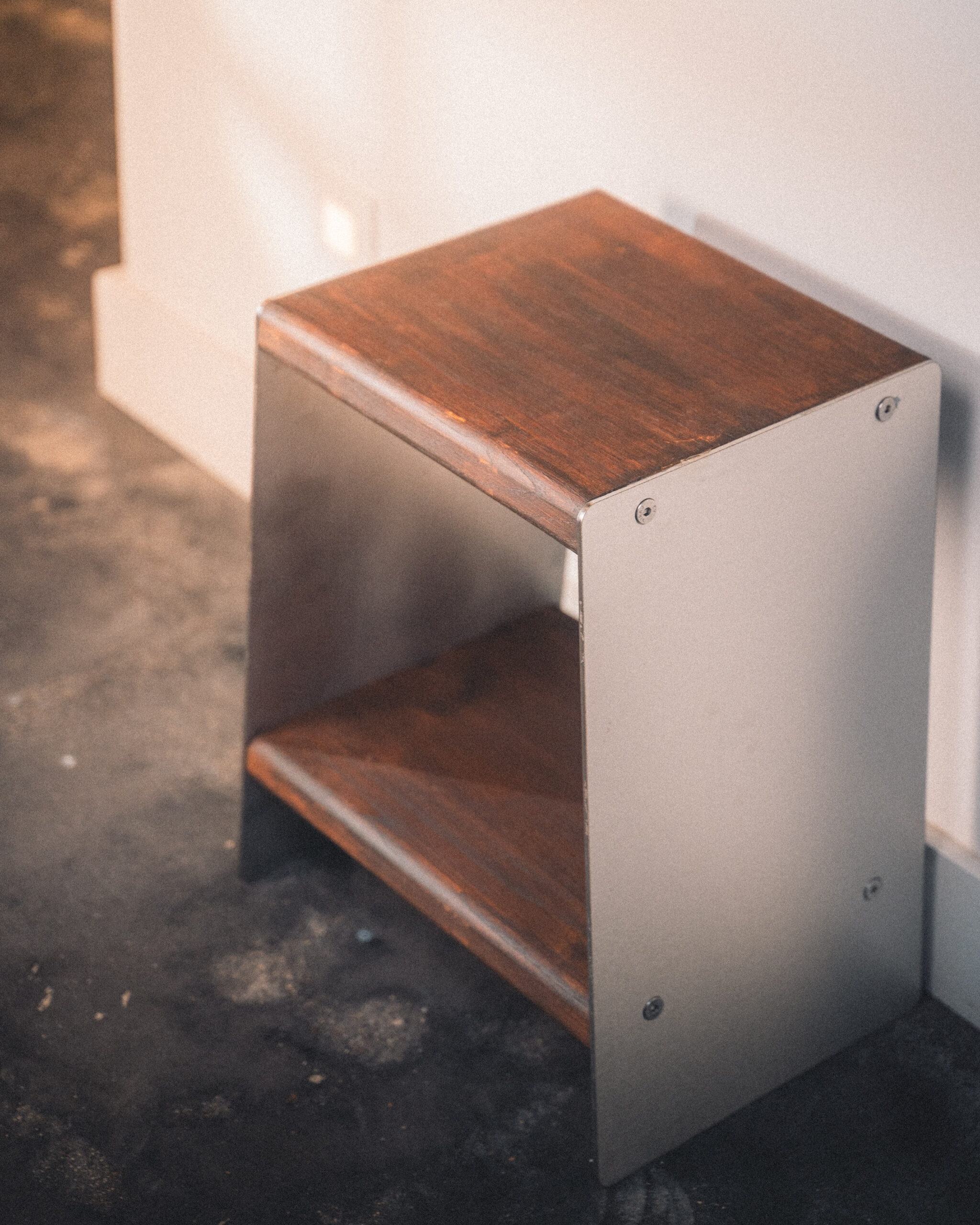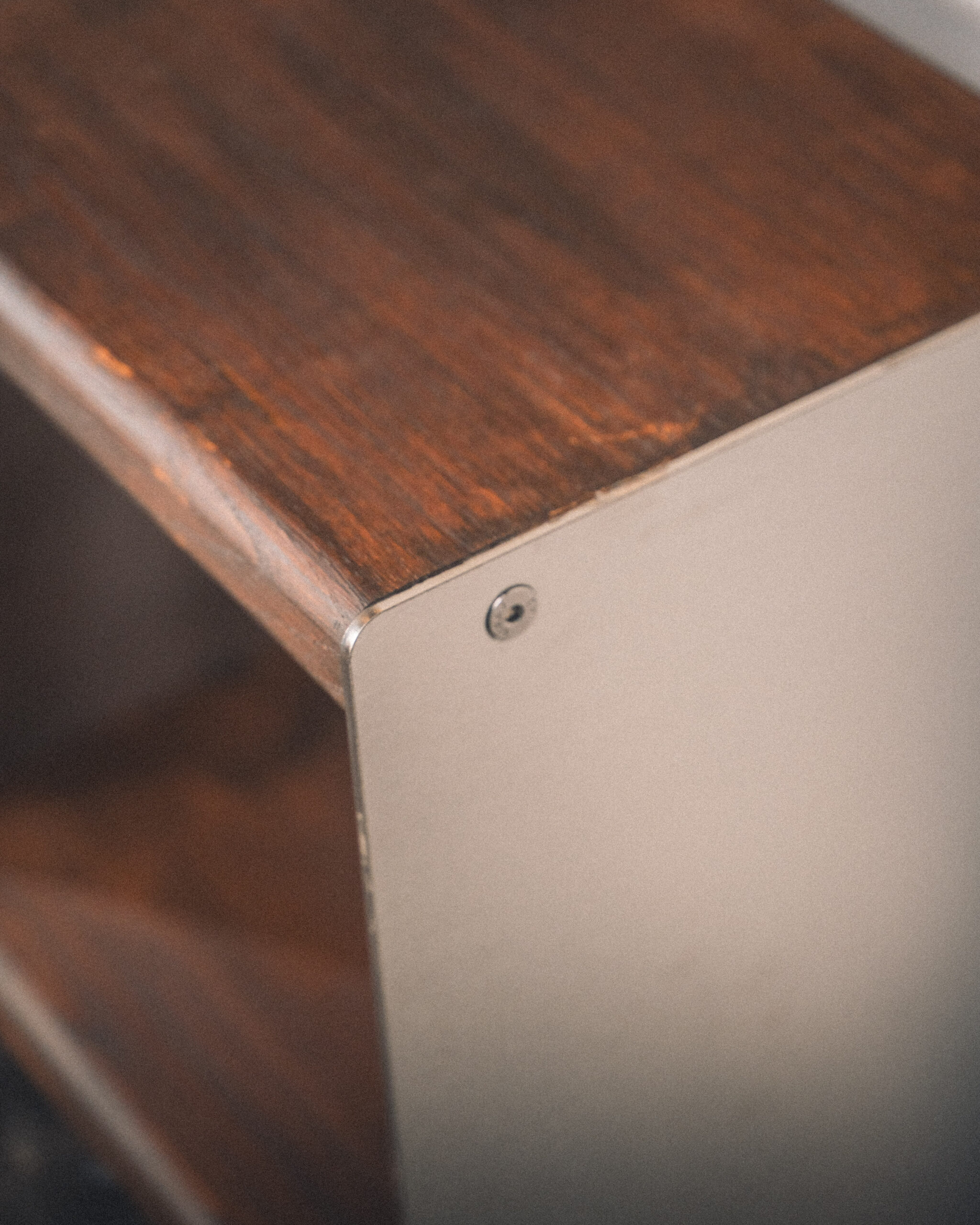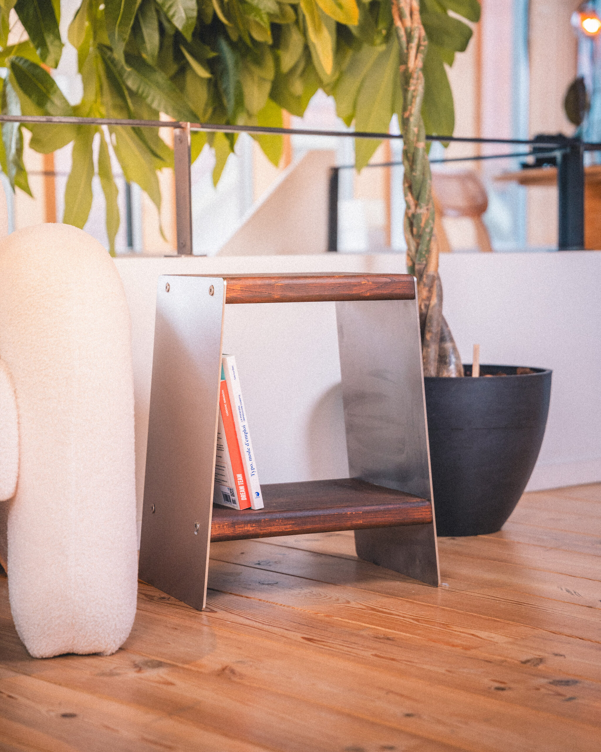 Les pieds en acier inoxydables de 4mm offrent une stabilité à la pièce et les plateaux en châtaigner teinté lui procurent de la chaleur.